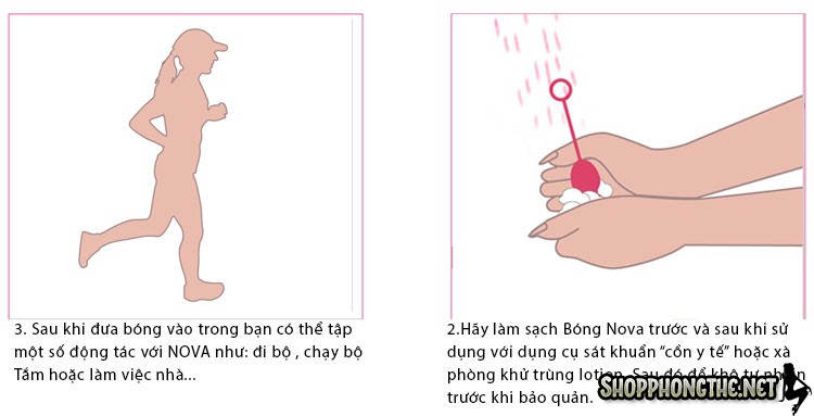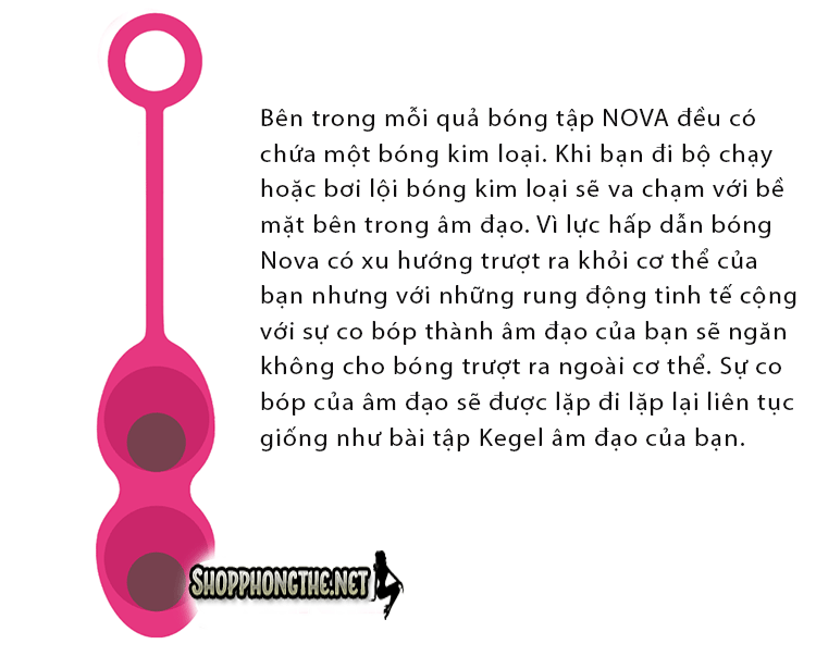 - Khi tập luyện với bóng SVAKOM Nova bạn nên kết hợp với bài tập đi bộ, chạy, bơi lội hay làm việc nhà... thay vì chỉ ngồi hoặc nằm yên tại chỗ. Bởi vì khi bạn vận động (hoặc vận động mạnh) mới giúp cho những quả bóng kim loại bên trong bóng Nova di chuyển bên trong âm đạo giúp co bóp và kích thích âm đạo mạnh hơn.