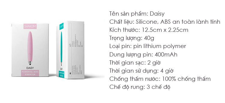 Với thiết kế nhỏ gọn nhưng toát lên vẻ thanh lịch, chất liệu silicon cao cấp cho phép đồ chơi tình dục Daisy dễ dàng lướt êm vào bên trong và trêu chọc những phần nhạy cảm của bạn. Thật đơn giản để sử dụng với 3 chế độ rung thông qua việc điều chỉnh 1 nút cho phép bạn dễ dàng chi phối các tốc độ kích thích, “sai khiến” Daisy phải tuân theo mọi ham muốn của bản thân. Khi thì thầm yêu thương, khi ồ ạt như thác lũ, lúc mạnh mẽ đến mệt nhoài, 3 tốc độ, 3 cảm xúc, 3 sự hoan lạc, đồ chơi tình dục Svacom Daisy tuyệt vời hơn cả một người bạn tình mà bạn hằng mơ.