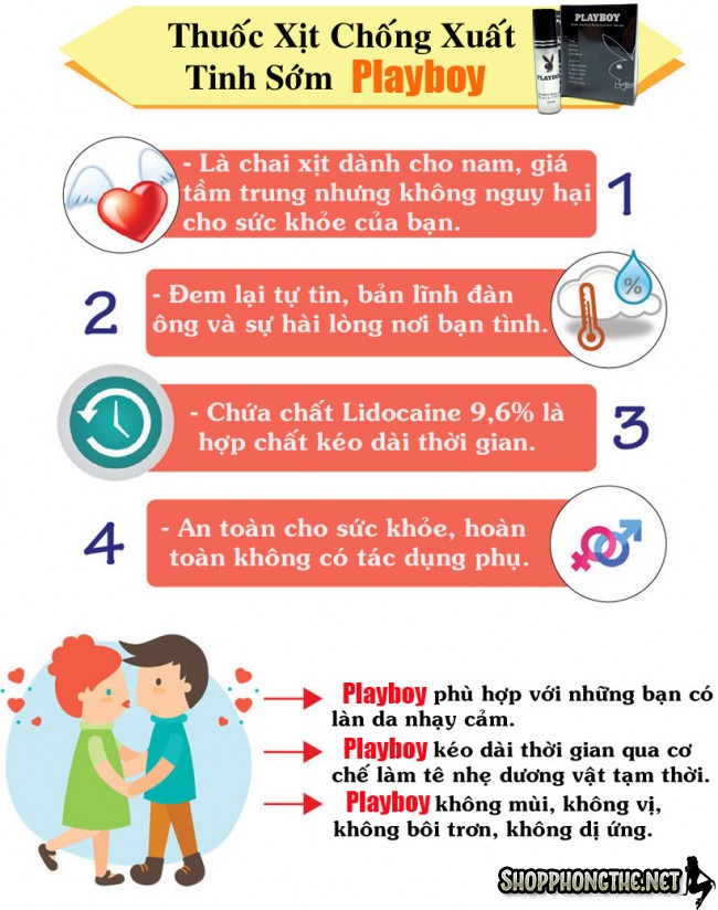 Playboy chính là vũ khí khiến các đấng mày râu lấy lại sự tự tin vốn có, trợ giúp cậu nhỏ hoạt động bền bỉ hơn bằng cách làm giảm sự nhạy cảm quá mức lên đầu dương vật ngay sau khi xịt vài phút.